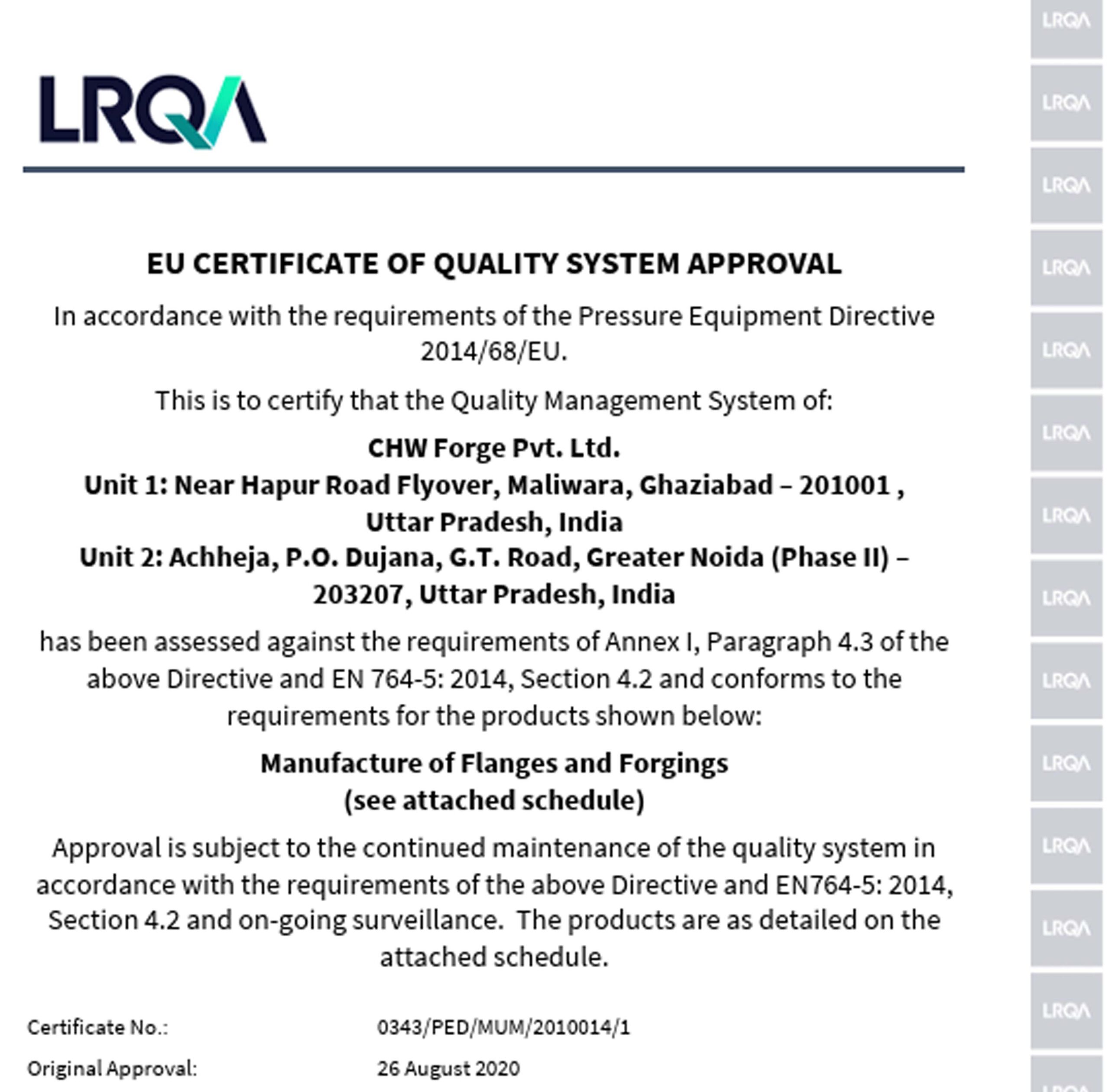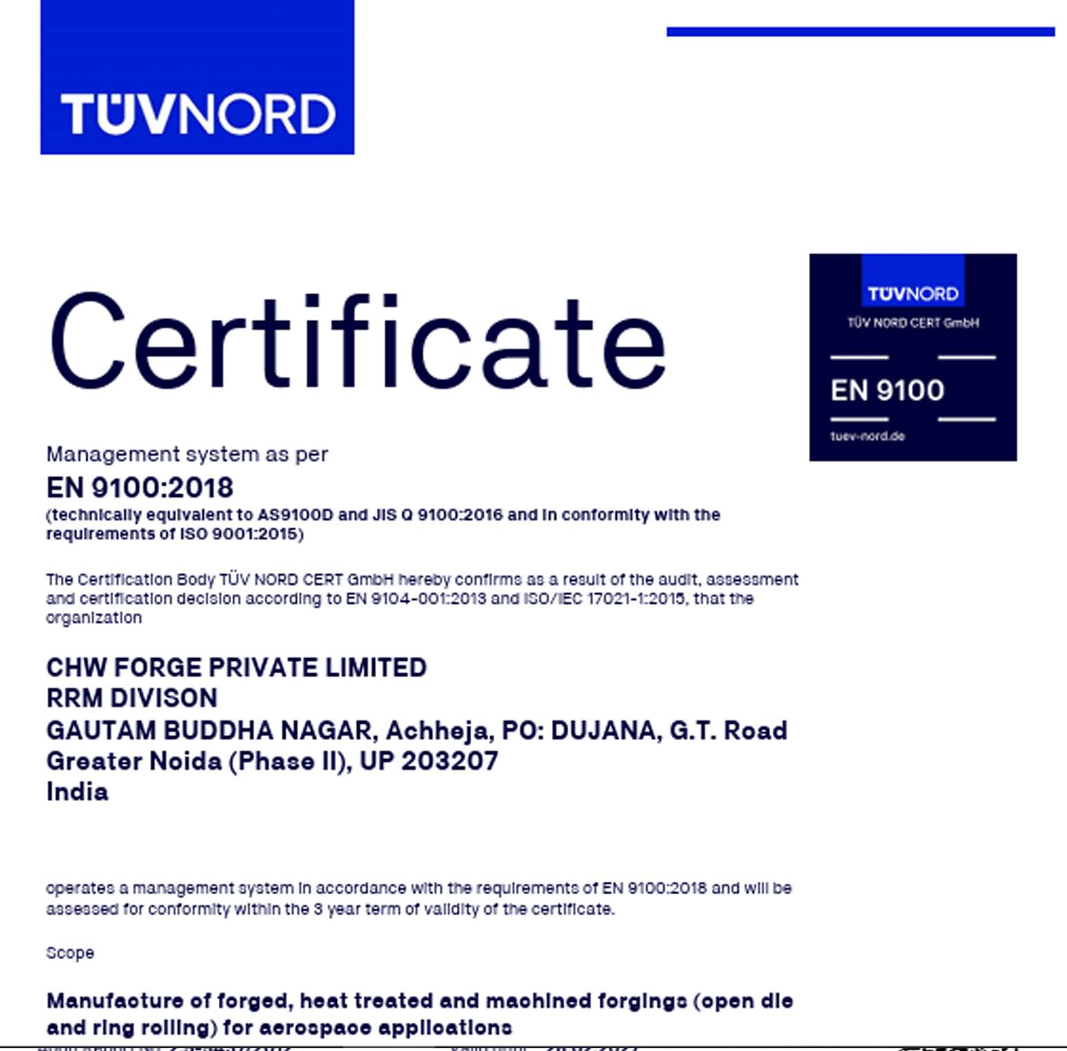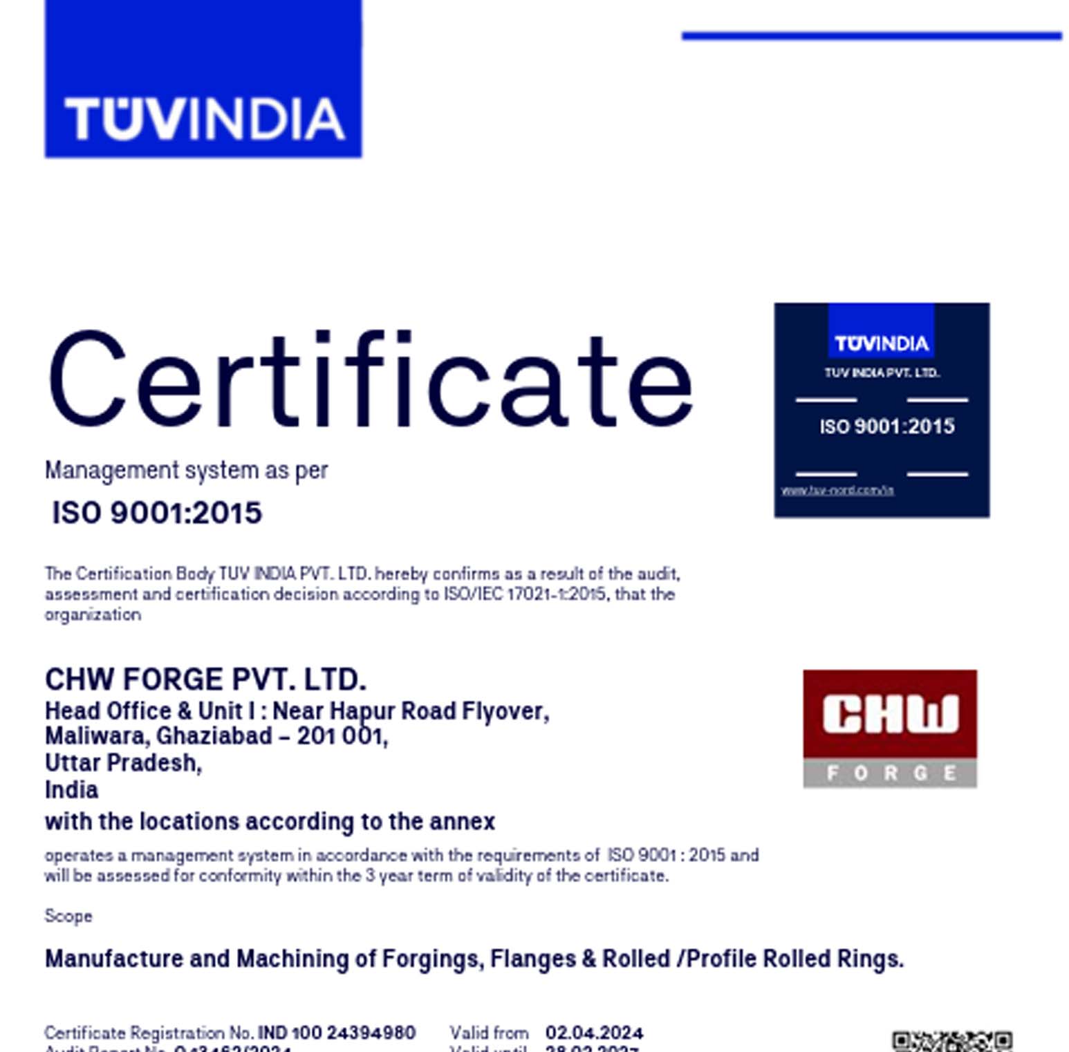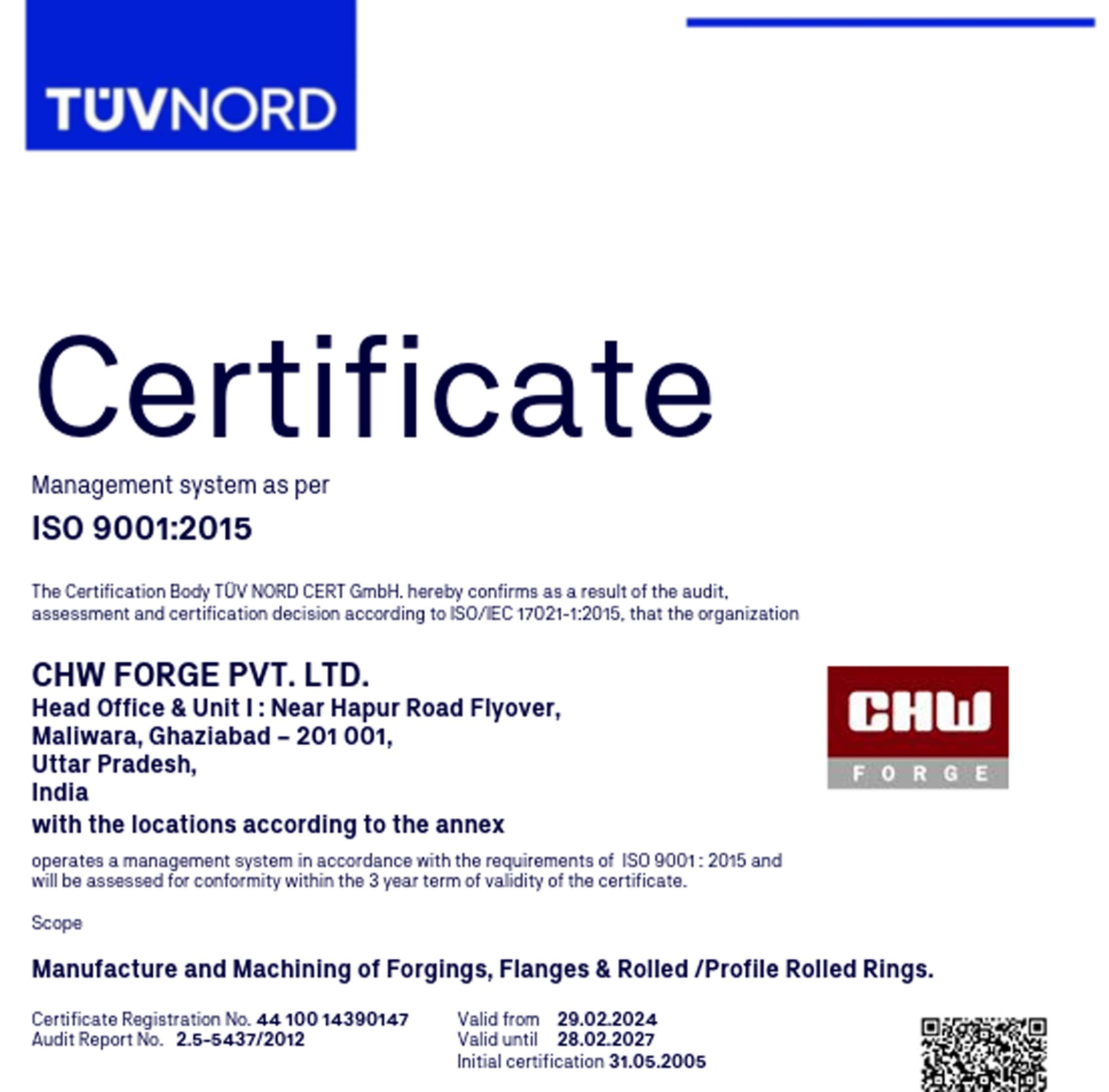 CHW Forge is certified by globally recognized agencies for ISO 9001, ISO 14001, ISO 45001, API 6A, PED, AD 2000-Merkblatt WO, EN 9100, and ISO 27001, reflecting our commitment to excellence across all processes.