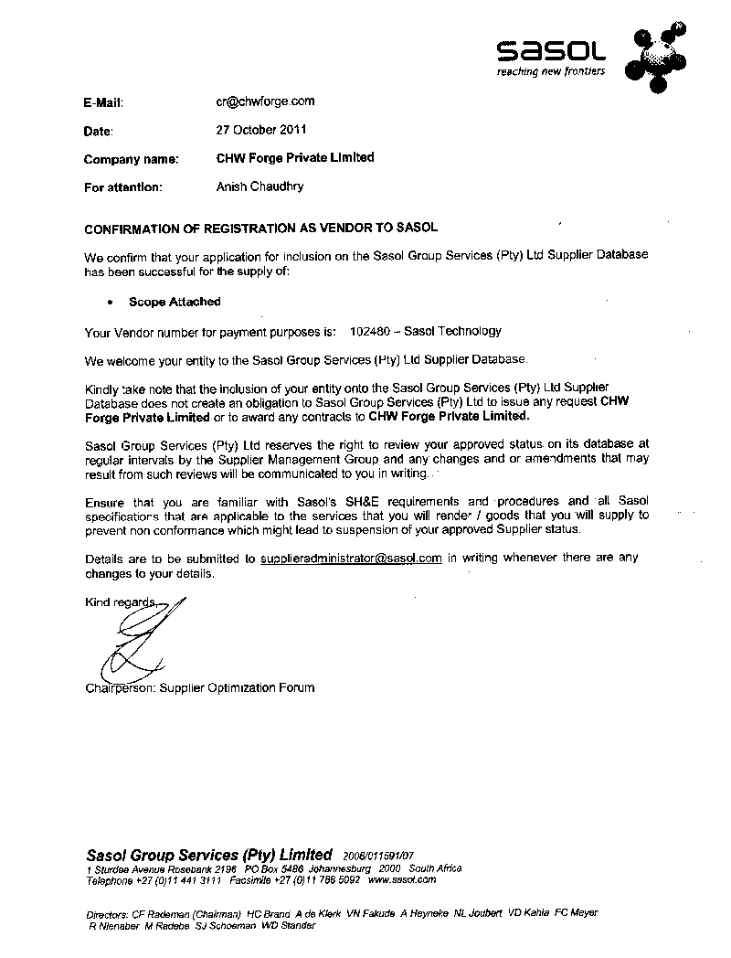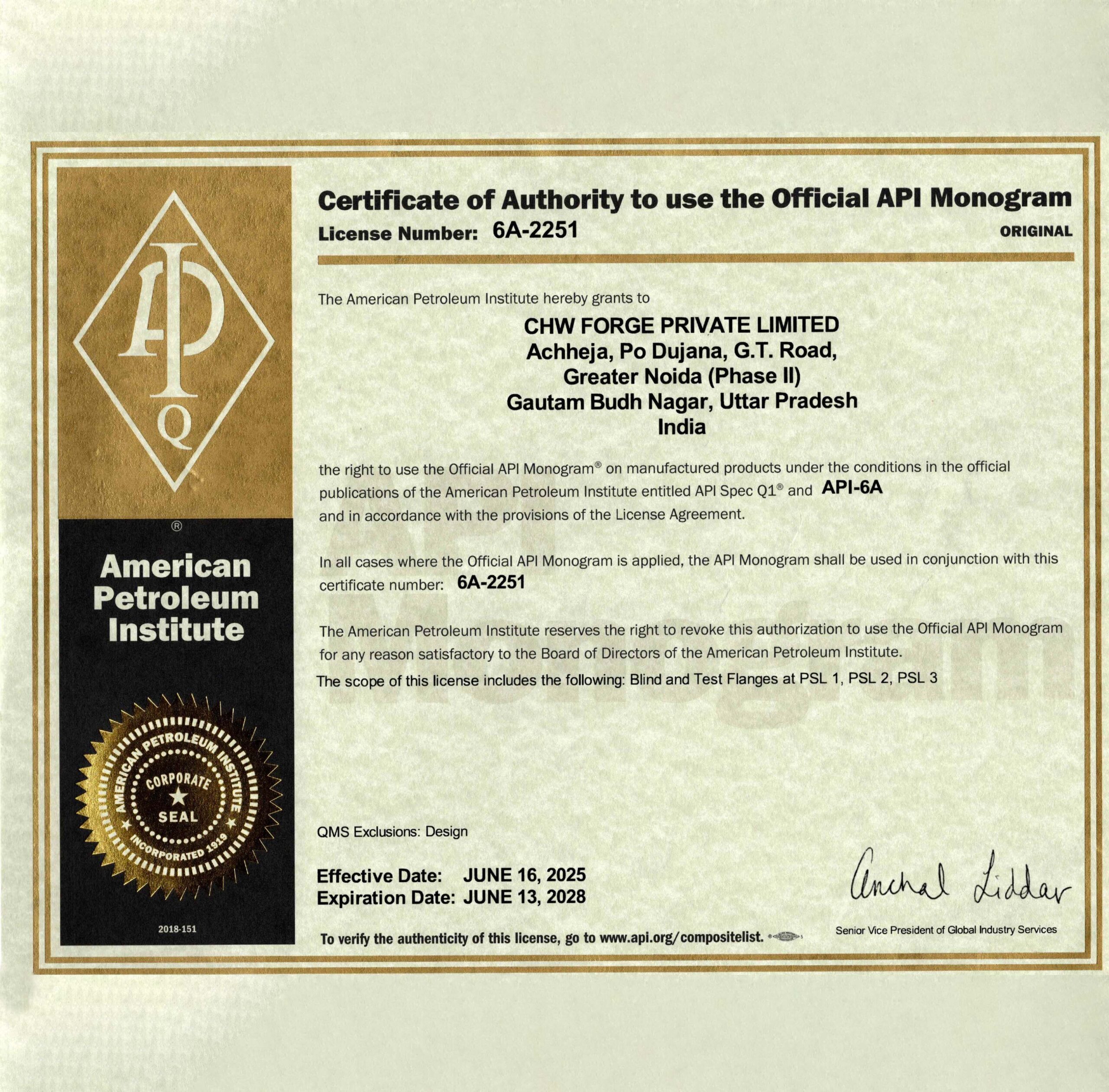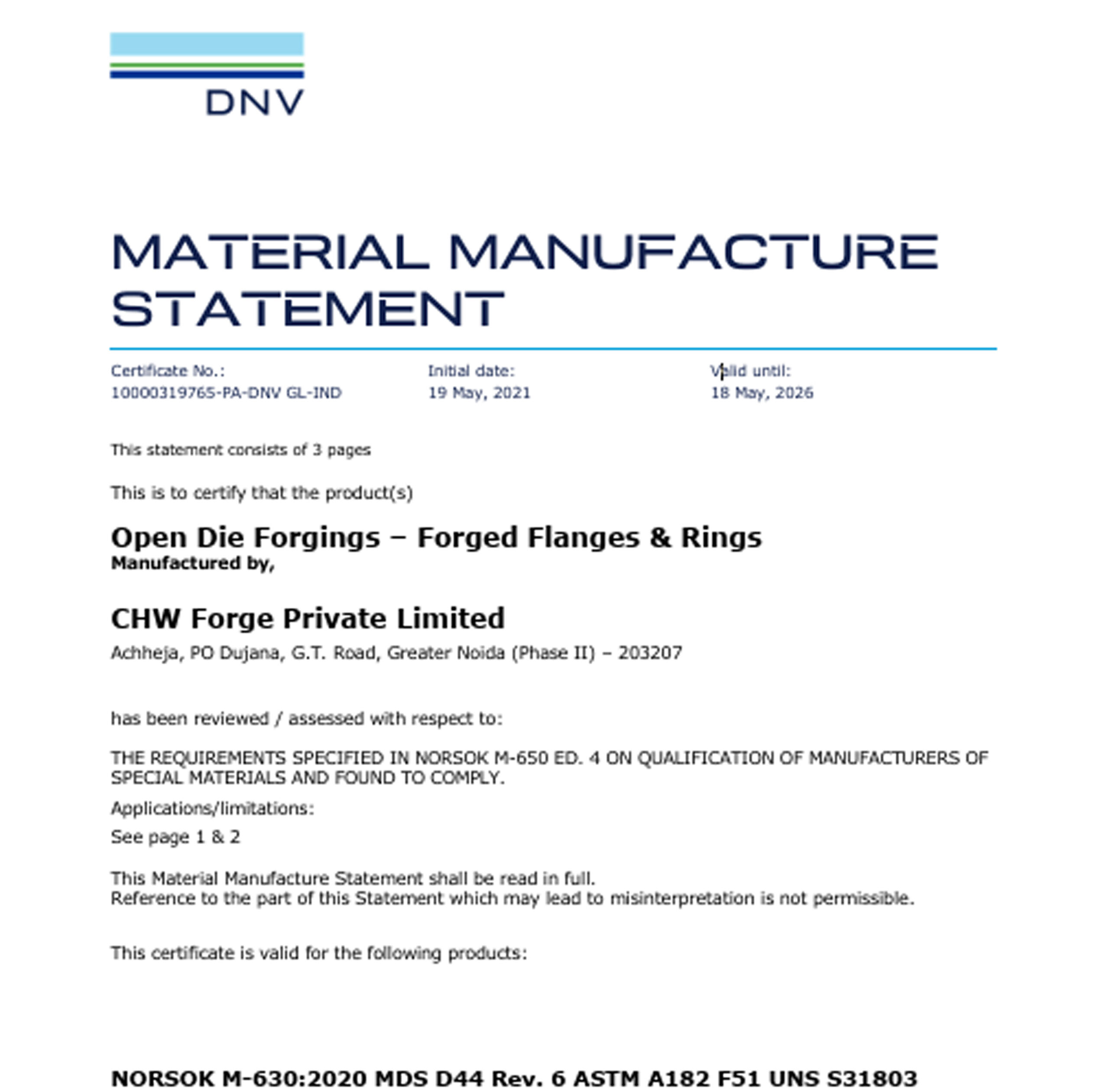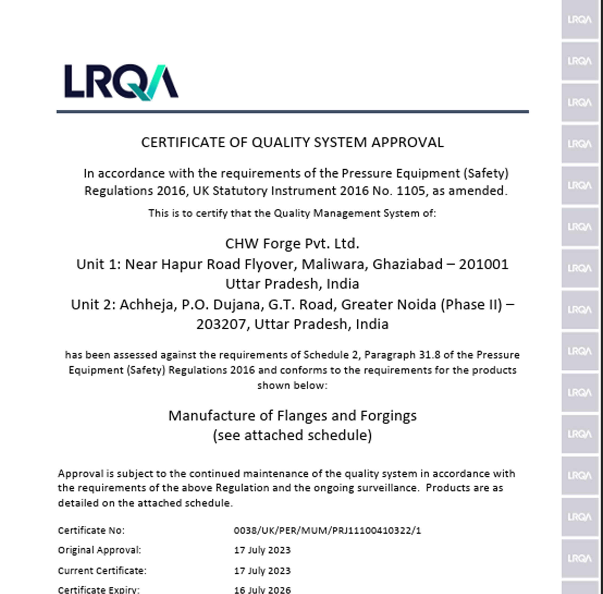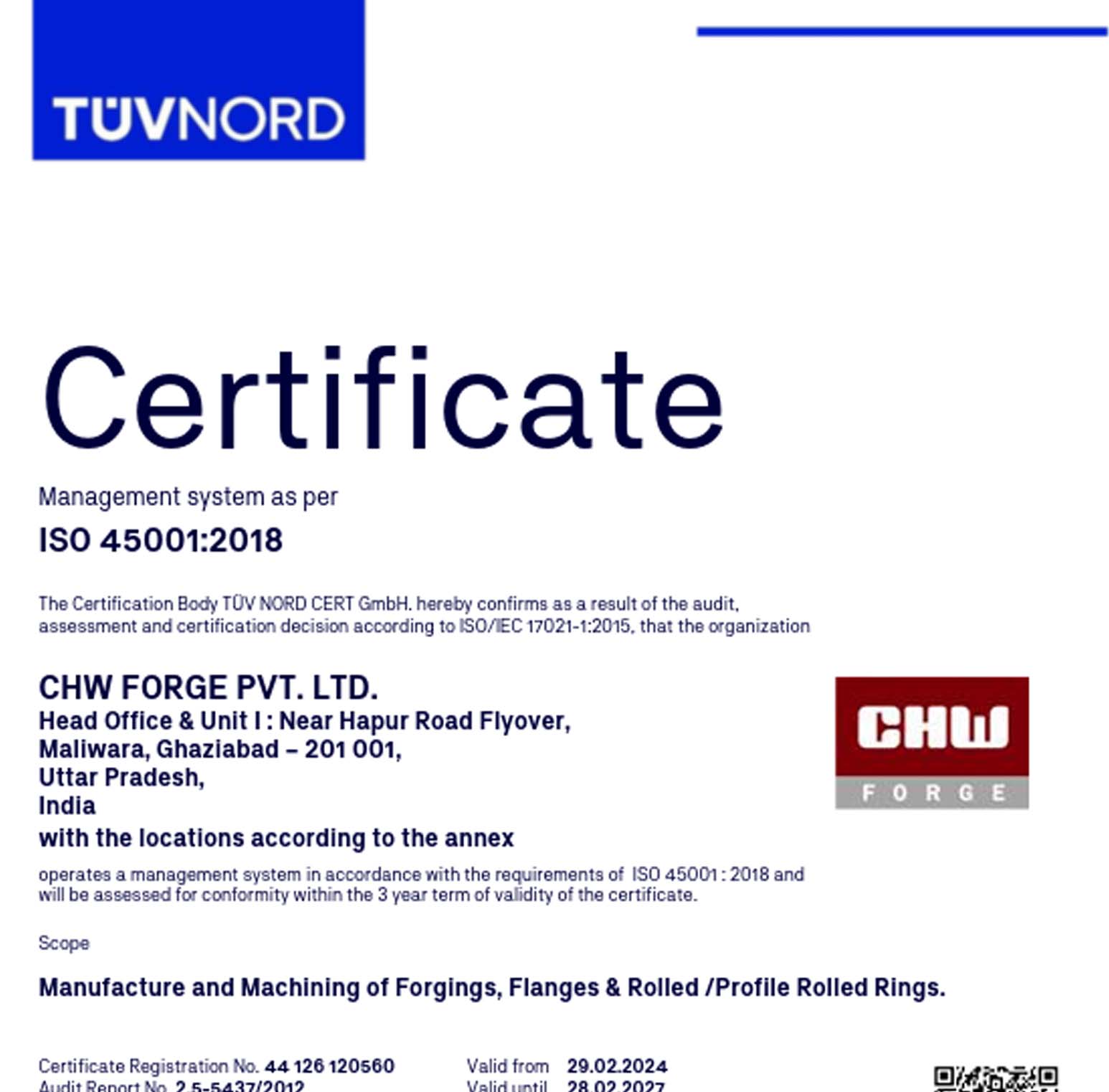 CHW Forge is certified by globally recognized agencies for ISO 9001, ISO 14001, ISO 45001, API 6A, PED, AD 2000-Merkblatt WO, EN 9100, and ISO 27001, reflecting our commitment to excellence across all processes.